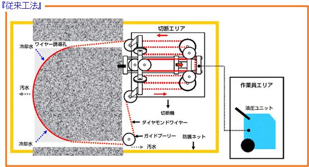 ワイヤーソーとは、ダイヤモンドビーズをはめ込んだワイヤーを被切断物(コンクリート)に巻きつけ、駆動機によって張力を与えながら20m~30m/秒で循環回転させることによって、被切断物(コンクリート)を内部にある鉄筋、鉄骨を含めてスピーディーに切断する施工方法です。